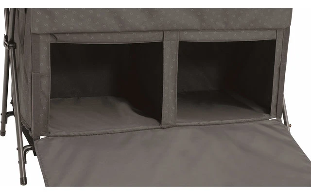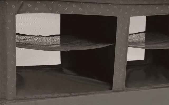 L’armoire de camping pliable Aruba en gris avec 4 compartiments de rangement et 2 compartiments en filet est idéale pour ranger les accessoires de camping. La porte robuste et rabattable avec poignée offre un espace de rangement utilisable et silencieux comme à la maison. La porte est équipée d’une fermeture magnétique. Sur le côté se trouve également un organisateur pratique et un crochet pour accrocher des objets. L’armoire de camping peut être utilisée toute seule ou avec l’organisateur Neat’n’Tidy. Sac de transport inclus pour faciliter le stockage et le transport.