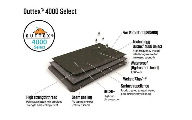 - Le toit clair de l’auvent dans une teinte chaude crĂ©e une ambiance claire et agrĂ©able dans la tente