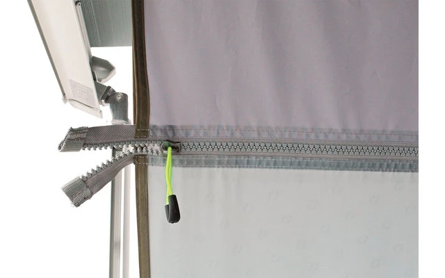 L’Outwell Fallcrest Side Panel Set se fixe sur le côté du store des camping-cars et assure l’intimité et une ombre supplémentaire ainsi qu’une protection contre la pluie et le vent. Il est zippé autour des bras articulés du store à l’aide d’une poche zippée, tandis que les cordes et les points d’ancrage assurent une stabilité fiable. Les deux parois peuvent être partiellement enroulées et fixées à l’aide de garrots. Même ainsi, elles offrent encore une protection contre les éléments. En combinaison avec le Hillcrest Tarp, les panneaux latéraux créent un vestibule bien protégé sous le store du bus. Leur très faible encombrement permet de les ranger facilement.